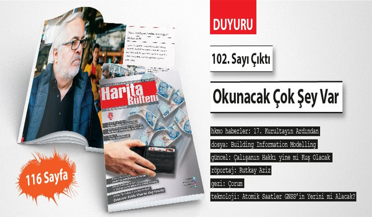 Harita Bülteninin 102.sayısını HKMO’ya kayıtlı bütün mühendisler Şube ve Merkeze Bağlı Temsilciliklerden ücretsiz olarak talep edebilir.