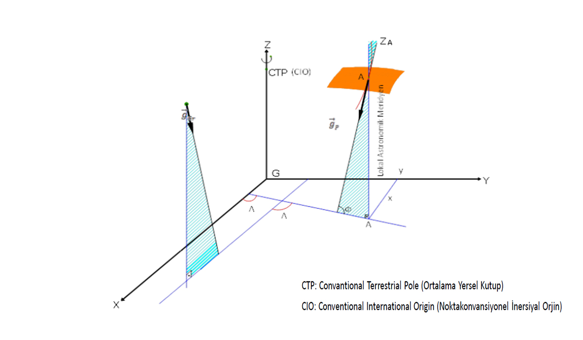 ⇒Yeryüzü noktası A dan X-Y düzlemine inilen dik (Z ye paralel) ile çekül doğrultusundan geçen düzlem A’nın astronomik meridyenidir. (A’daki çekül doğrultusu, Z dönme eksenine göre çarpık durduğundan, A dan Z ye çizilen paralel ile çekül doğrultusunun oluşturduğu lokal astronomik meridyen düzlemi, Z dönme eksenini içermez. Bunun için de G, A’nın lokal astronomik meridyeni içinde bulunmaz.